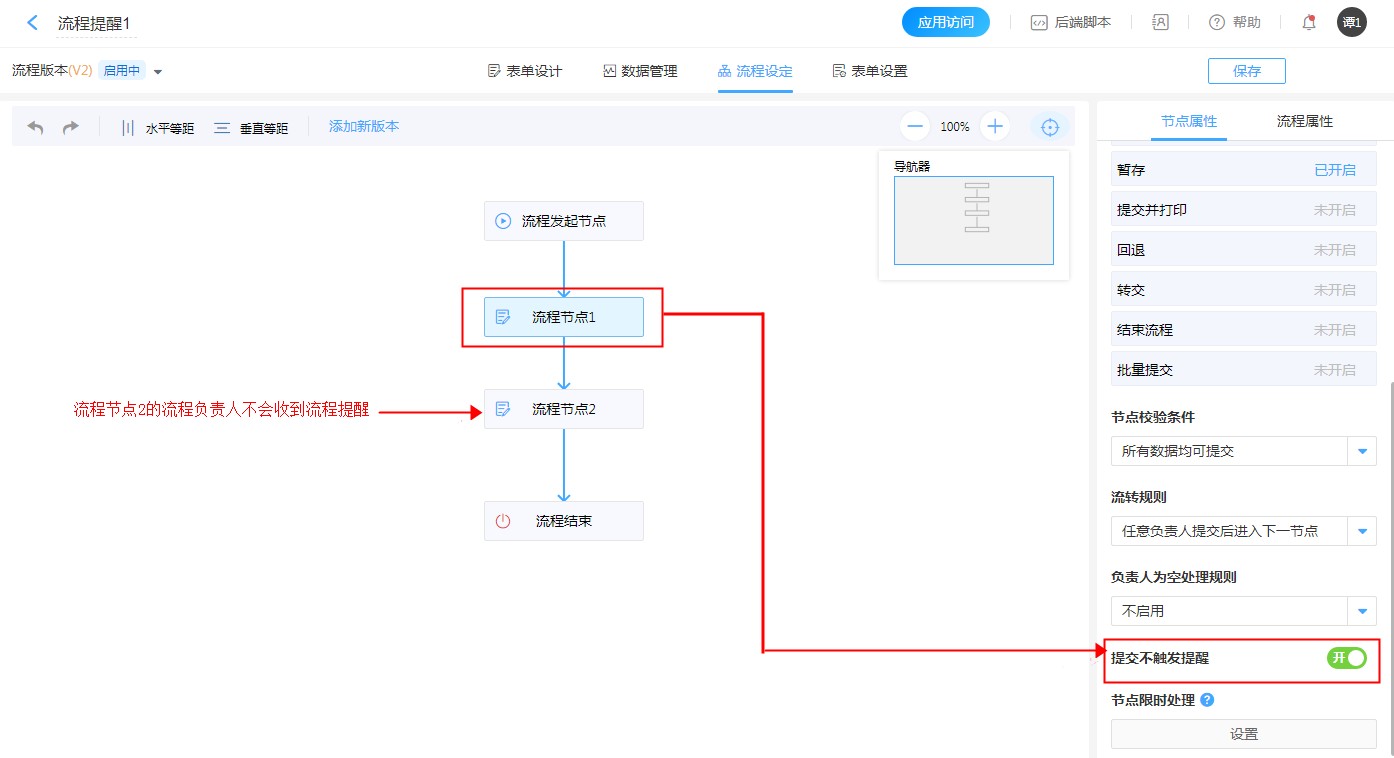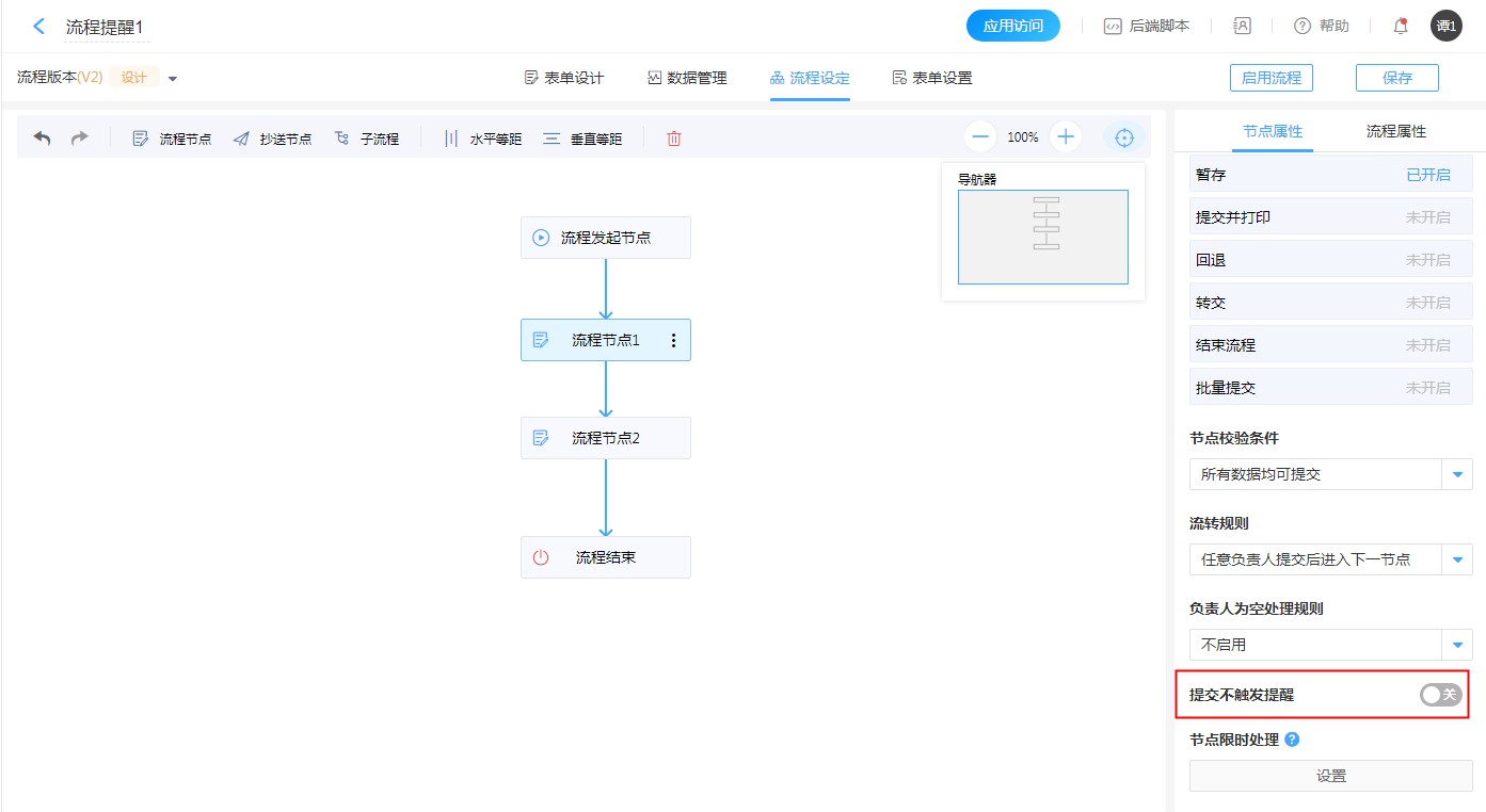 【流程设计】-【流程设定】-【节点属性】-【更多属性】-【提交不触发提醒】