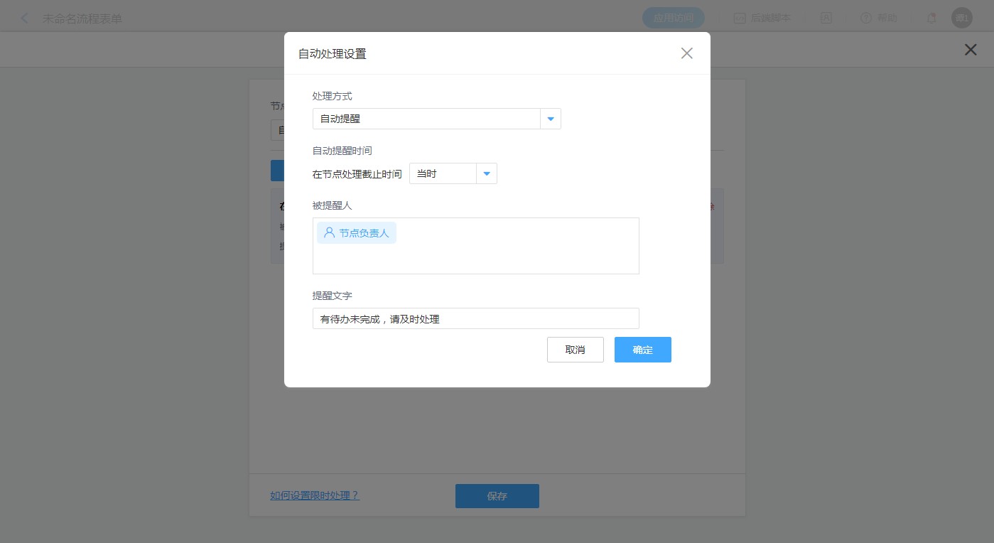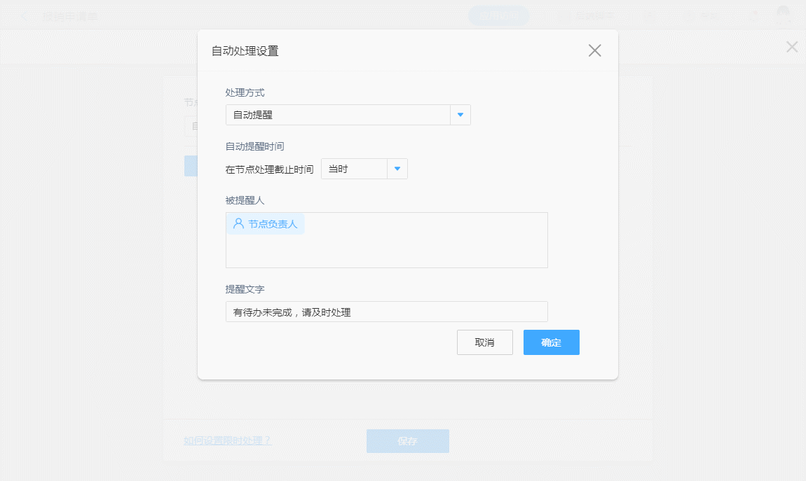 「自动提醒时间」指的是流程超过设定的截止时间后或者在到达截止之间之前,系统提醒「被提醒人」的时间。自动提醒时间可以是节点截止处理时间当时、之前以及之后这三种提醒时间,单位可选「分钟」、「小时」、「天」。