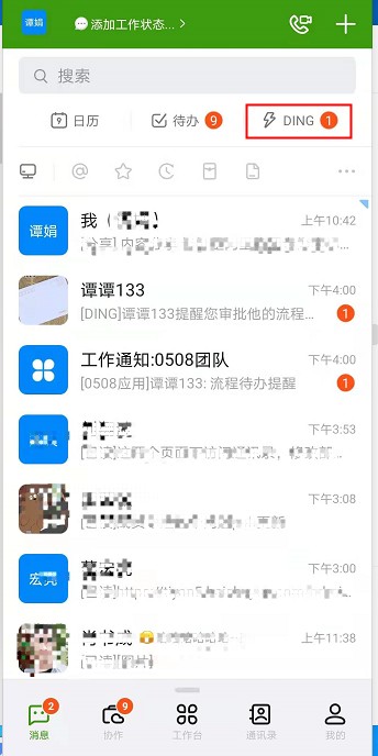流程节点负责人收到催办后,有 DING消息,并在我的待办下,发现流程有催办标识。
