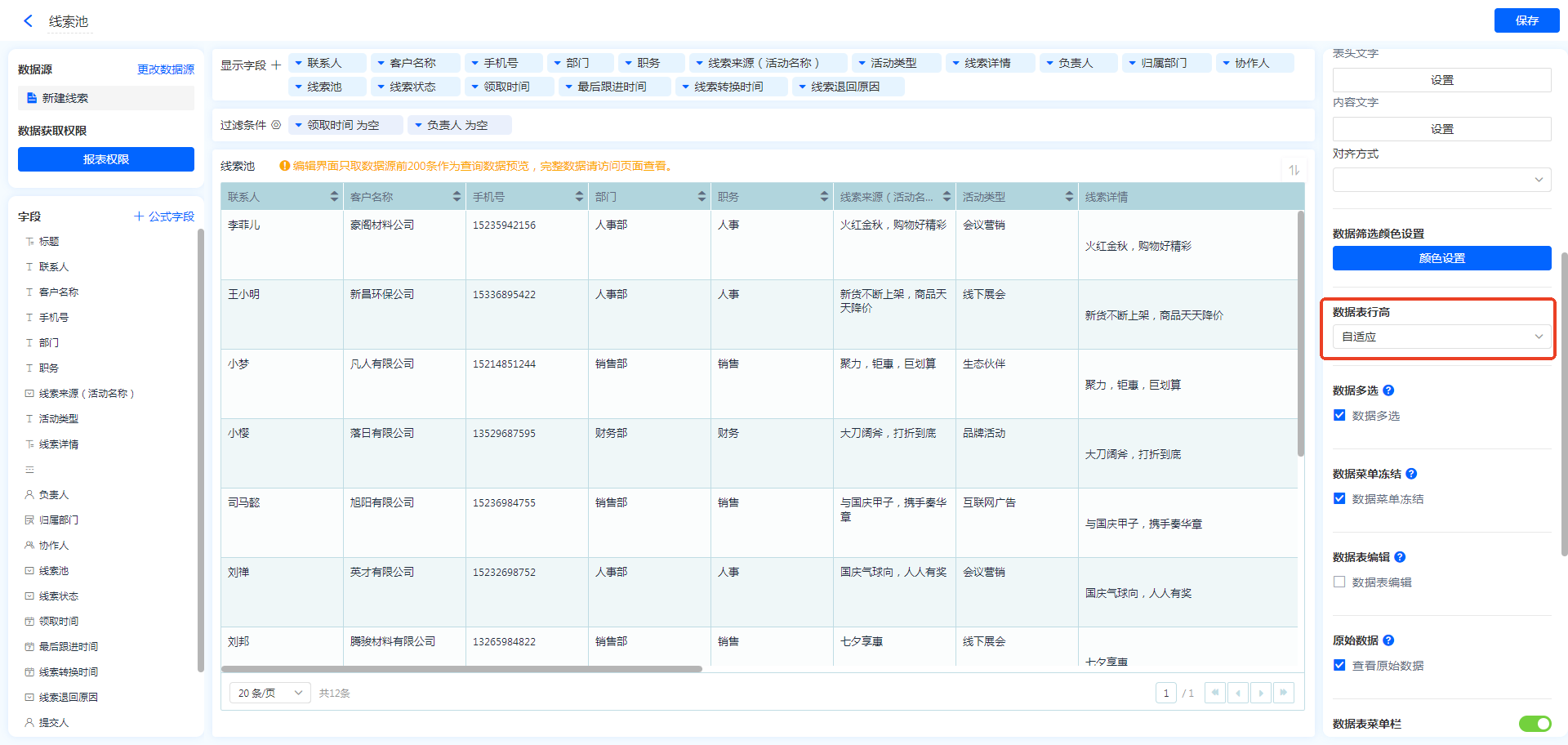 除了以上基础的设置,数据表还支持如下高级功能的设置