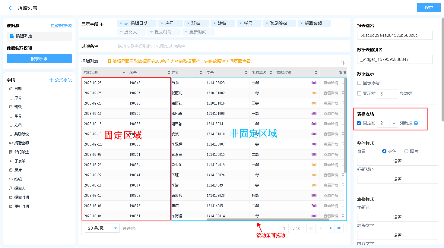 如数据表显示字段过多,可通过设置表格冻结,固定显示前N列,方便进行数据查看。