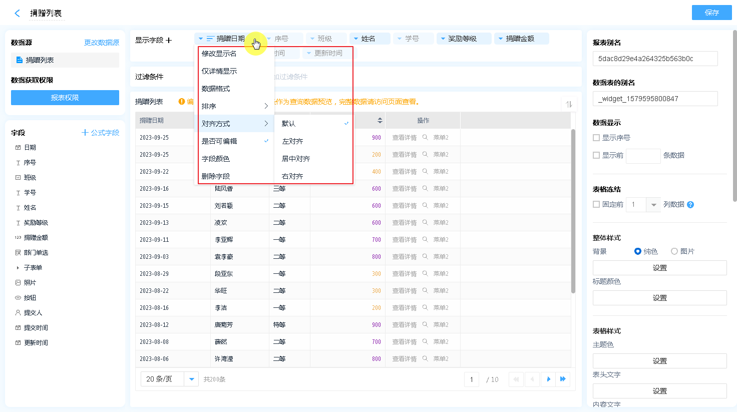 注意:需要数据源表单开启表格快捷编辑(在表单设置-更多设置中开启),数据表才会显示此属性。