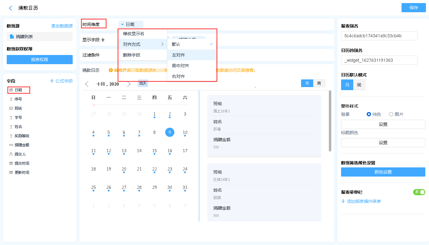 日历的设计区分为 维度、显示字段、过滤条件以及数据显示区。
