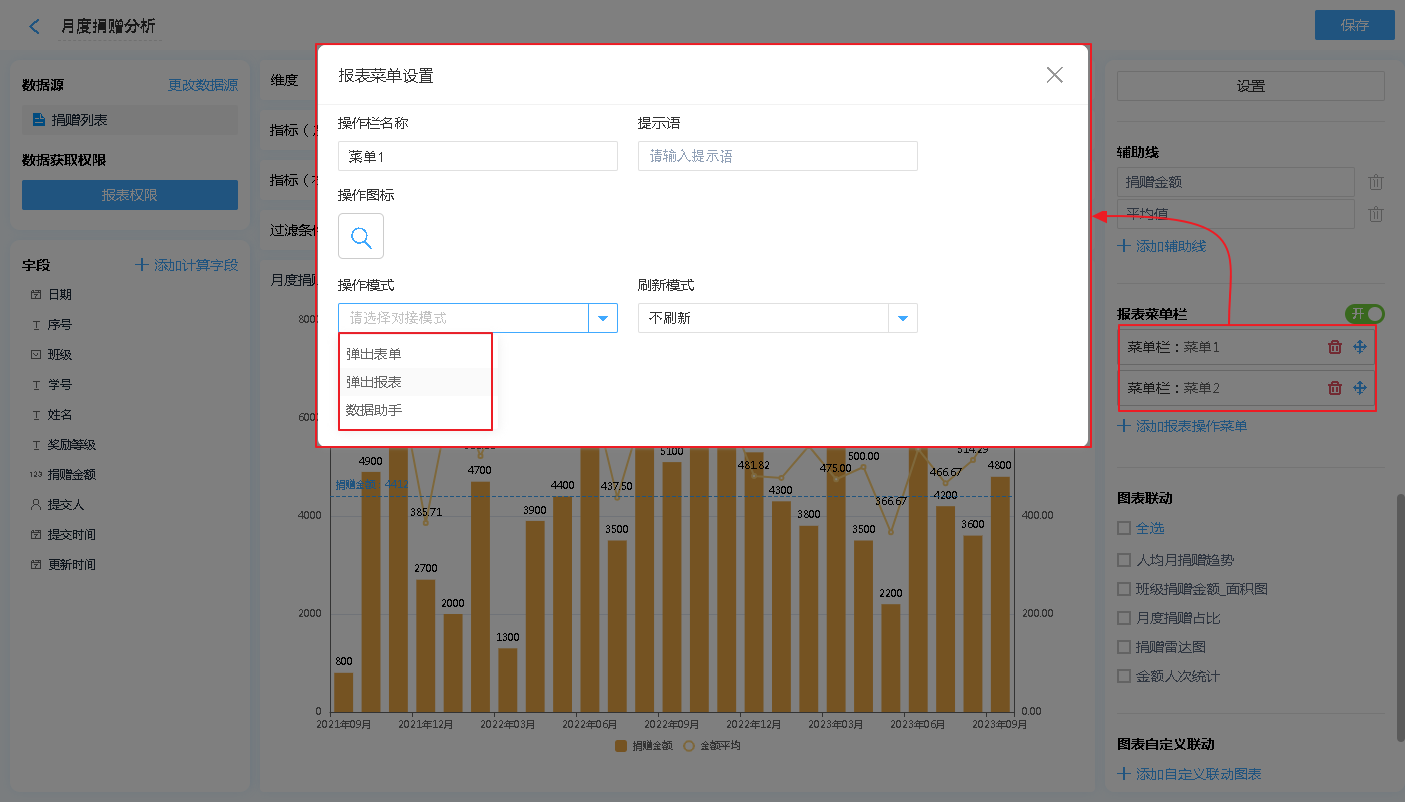 报表菜单 支持 弹出表单、弹出报表、数据助手