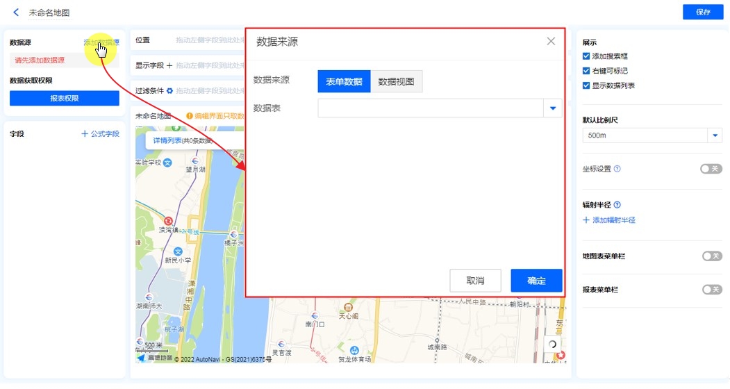 数据源就是指当前地图场景报表的数据来源,可以是表单、数据视图。