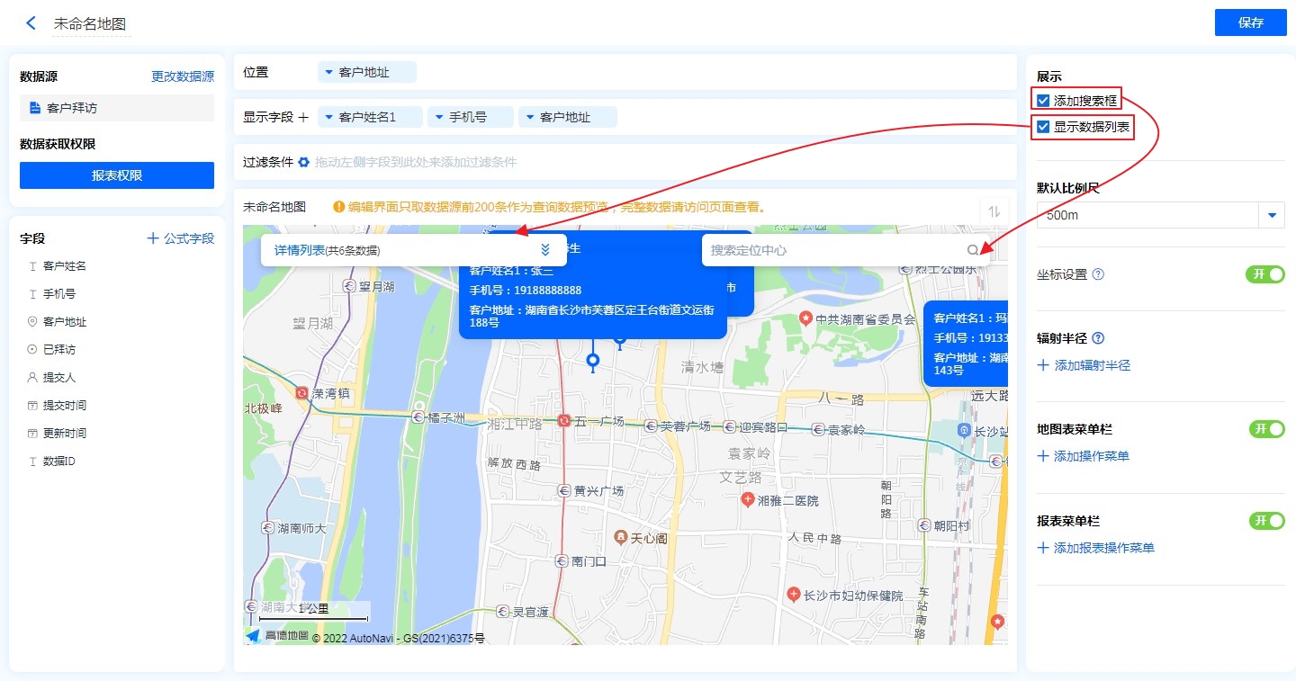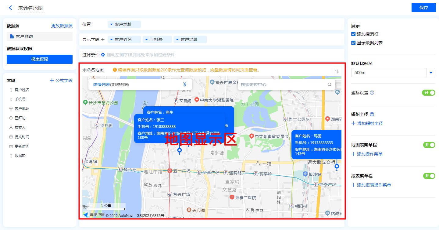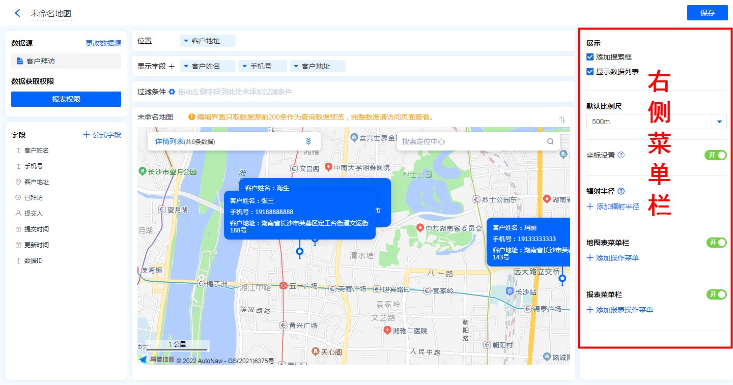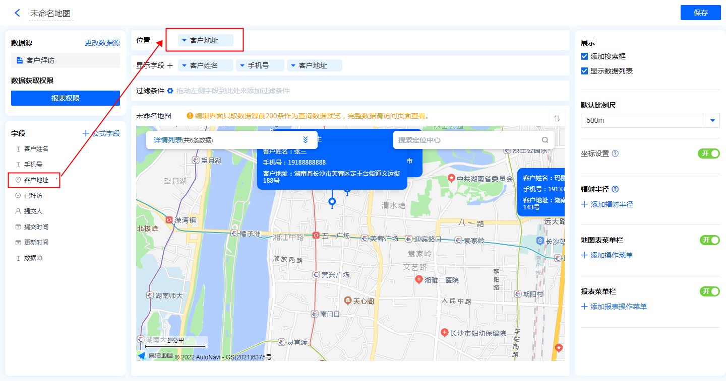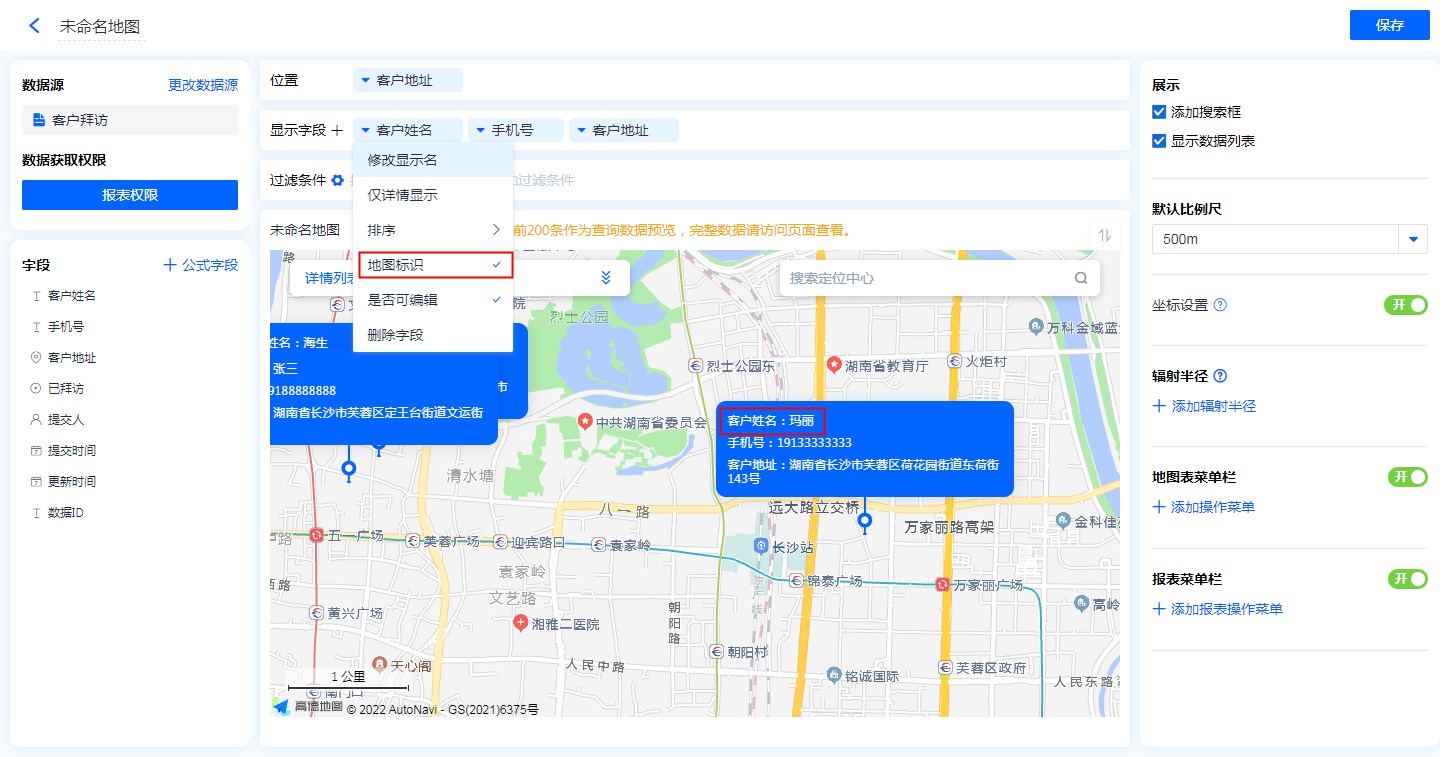 • 地图标识功能:显示字段勾选地图标识功能后,地图的位置标记处会显示该字段信息。