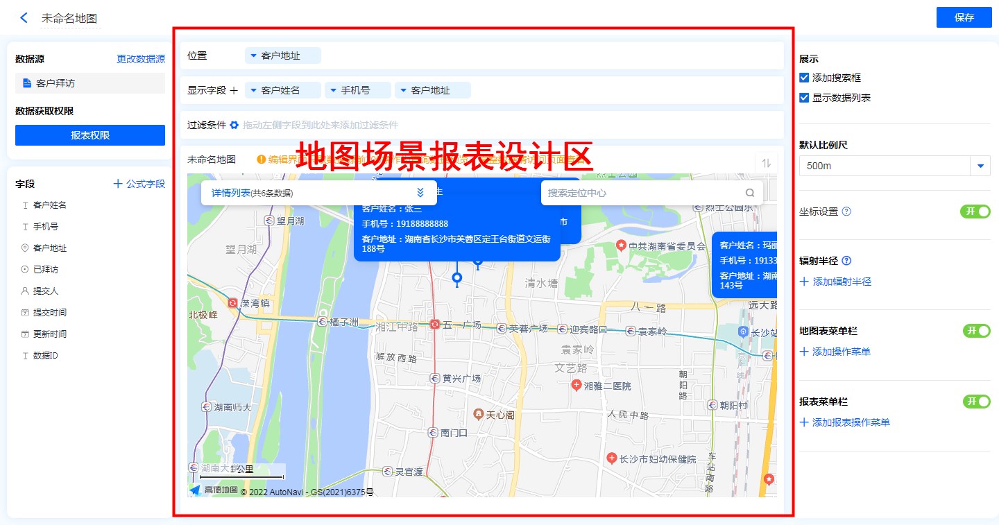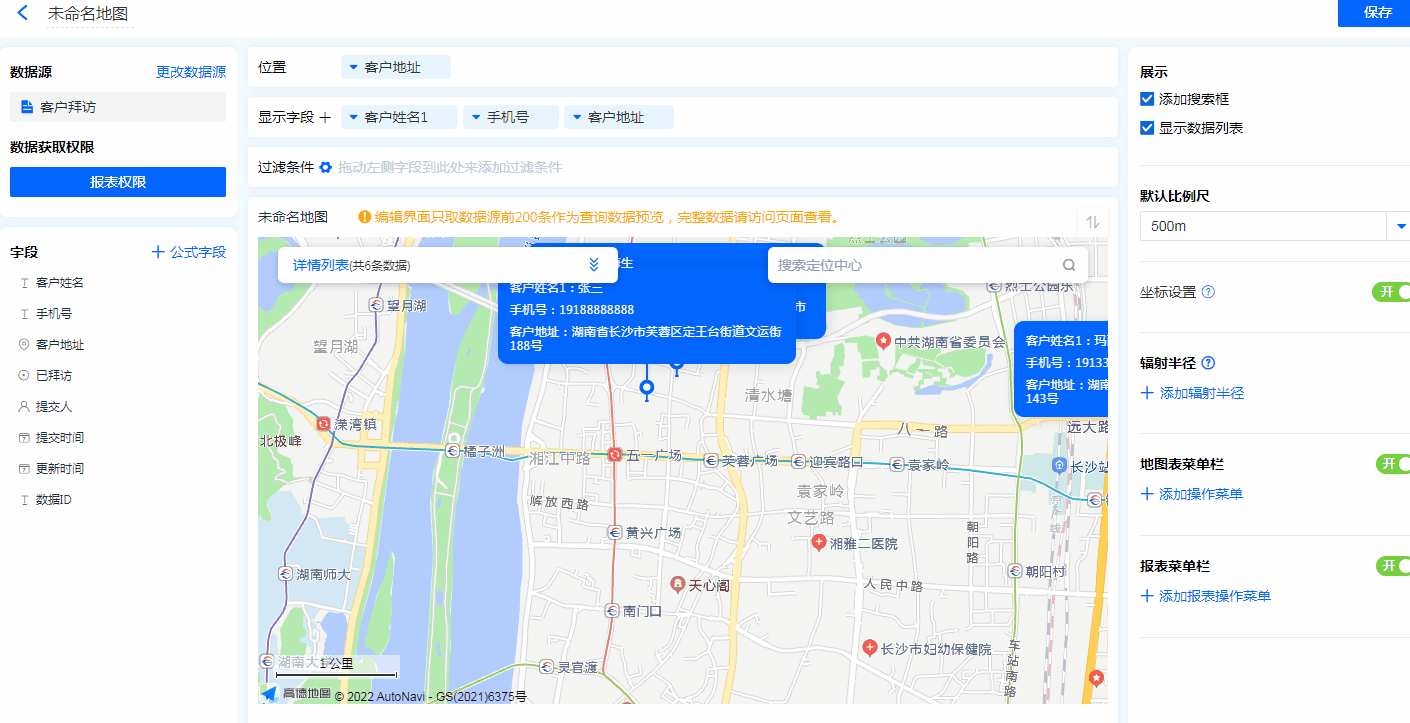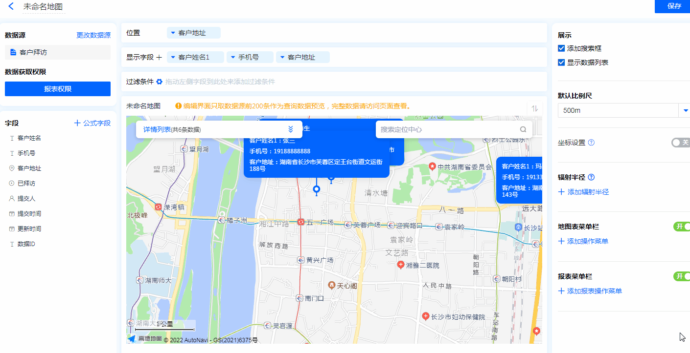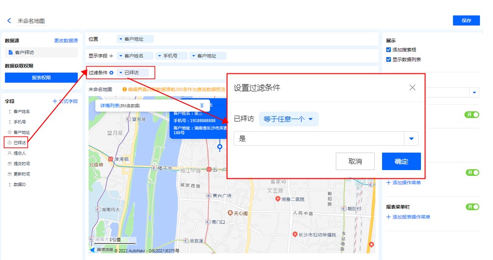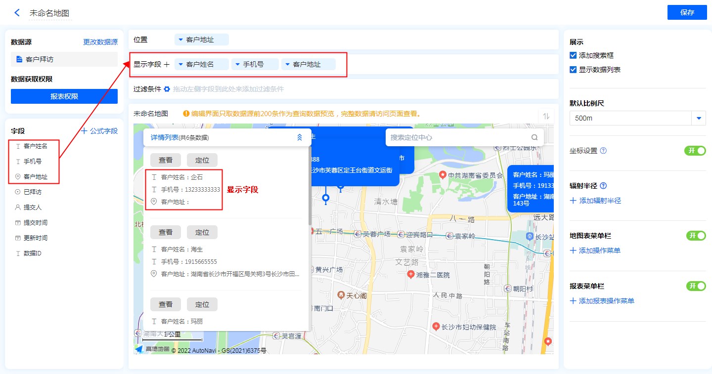 • 地图标识功能:显示字段勾选地图标识功能后,地图的位置标记处会显示该字段信息。
