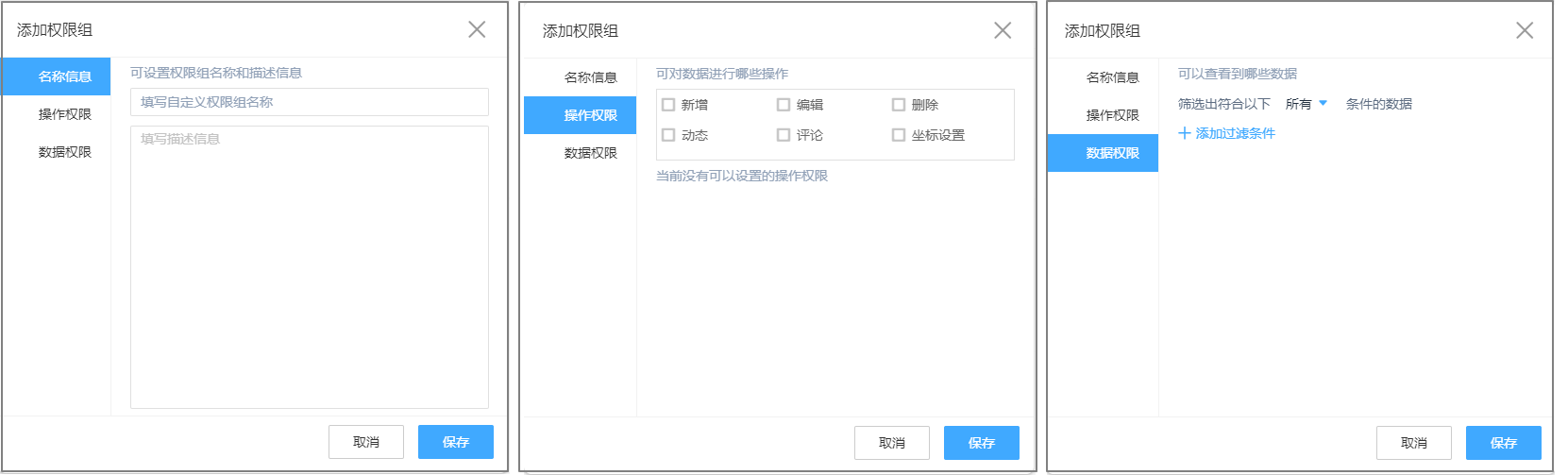 管理本人数据 新增、编辑、删除、动态、评论、流程日志、坐标设置 自定义 提交人为自己的数据
