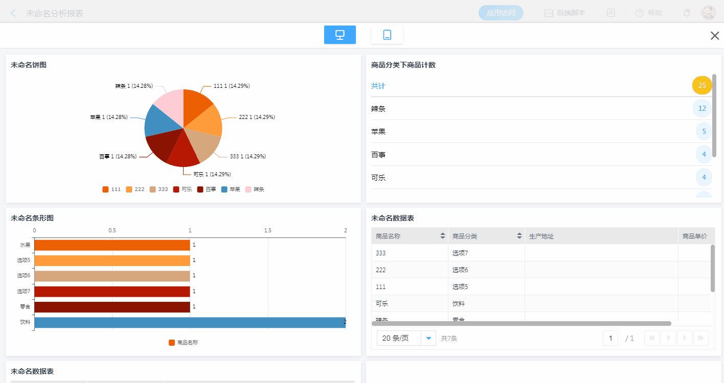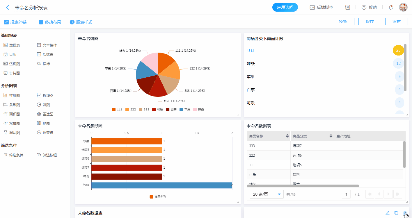 饼图展示了各商品的占比,联动数据表,可以看到每种商品的占比数据对应的明细。