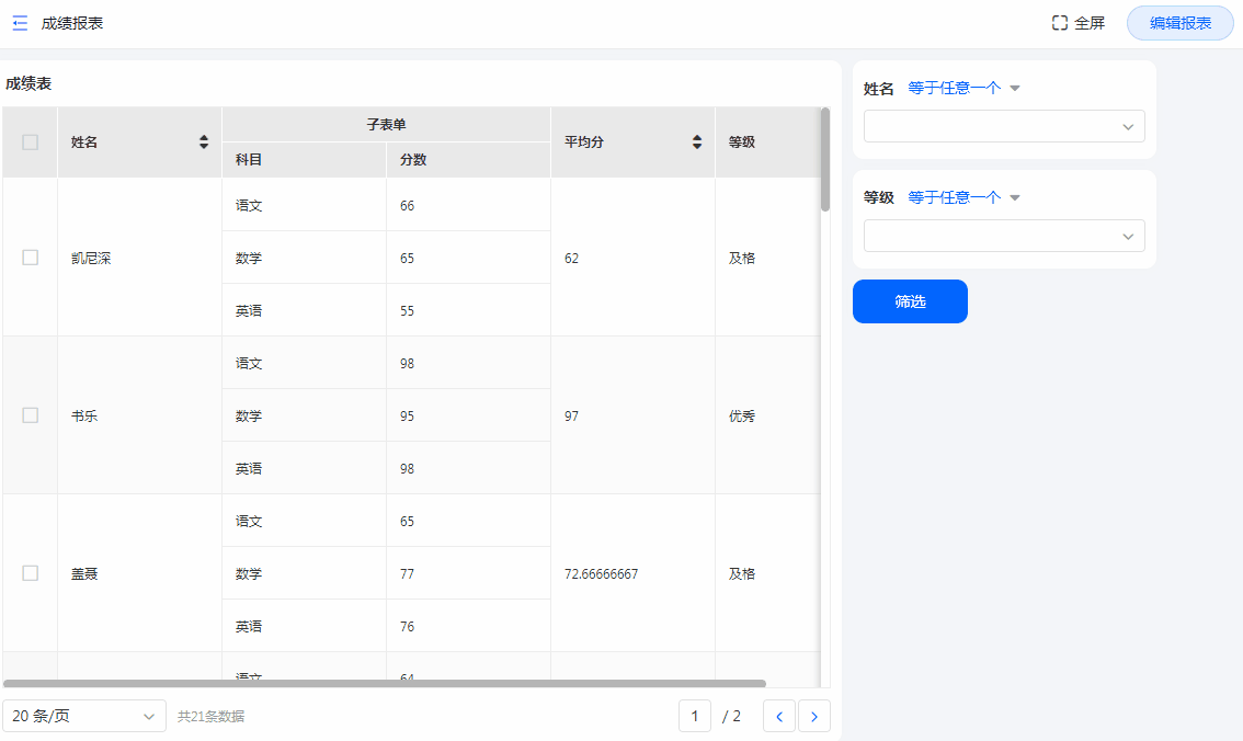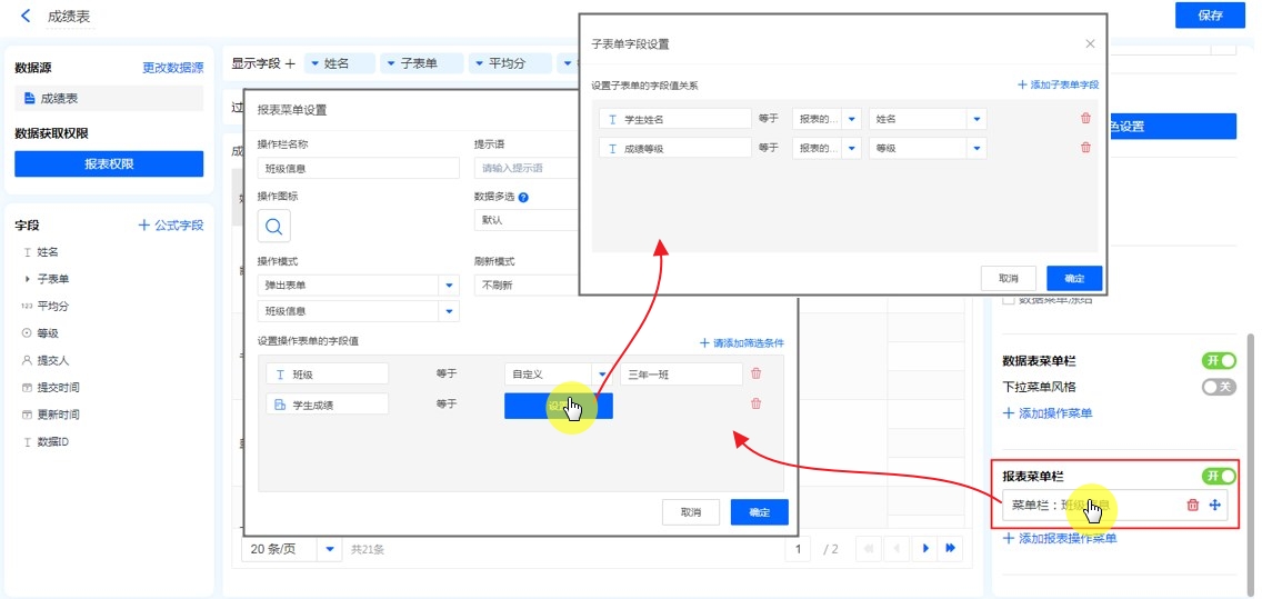 示例:当前报表为学生成绩表,想要实现把学生姓名和等级信息填入班级信息表的子表单字段中。