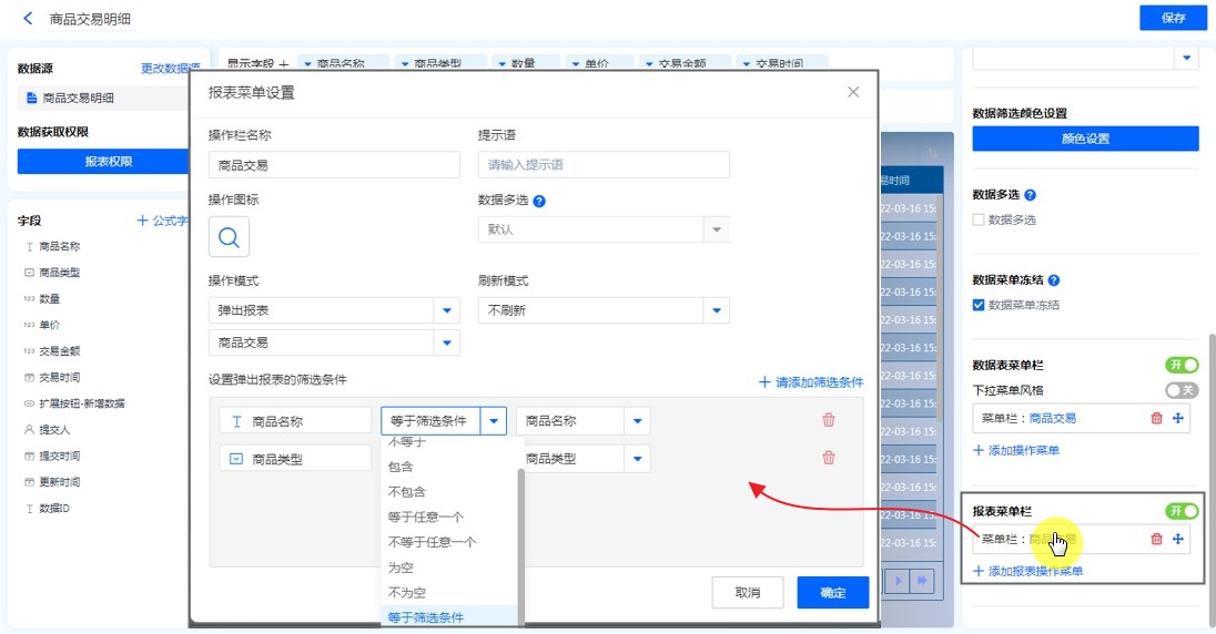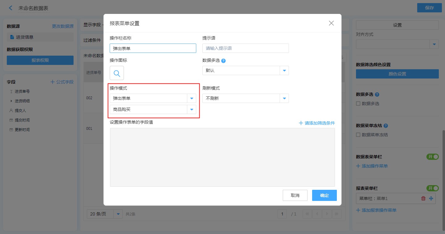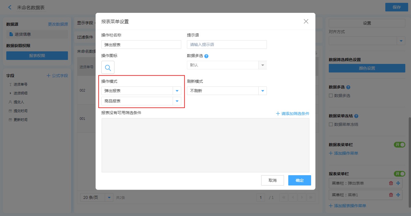 第一步:【目标报表的编辑页面】——【报表菜单栏】——【添加操作菜单】,配置相关属性,操作模式选择【弹出表单】并选择表单,添加筛选条件,保存。