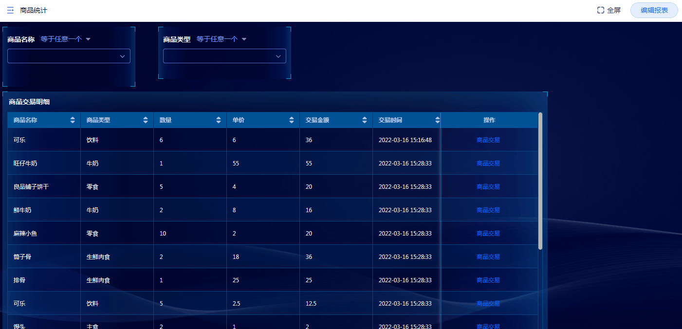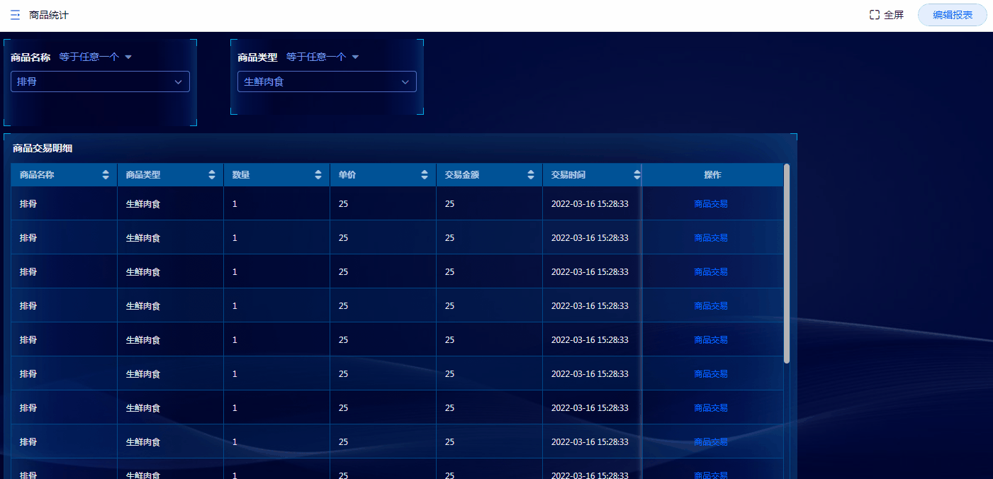 • 弹出报表可以用于查询数据,在单条数据的操作栏点击按钮即可弹出对应的报表,并可传入筛选条件进行查询数据。