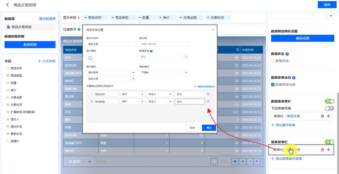 第一步:【目标报表的编辑页面】——【报表菜单栏】——【添加操作菜单】,配置相关属性,操作模式选择【弹出抱表】并选择报表,添加筛选条件,保存。