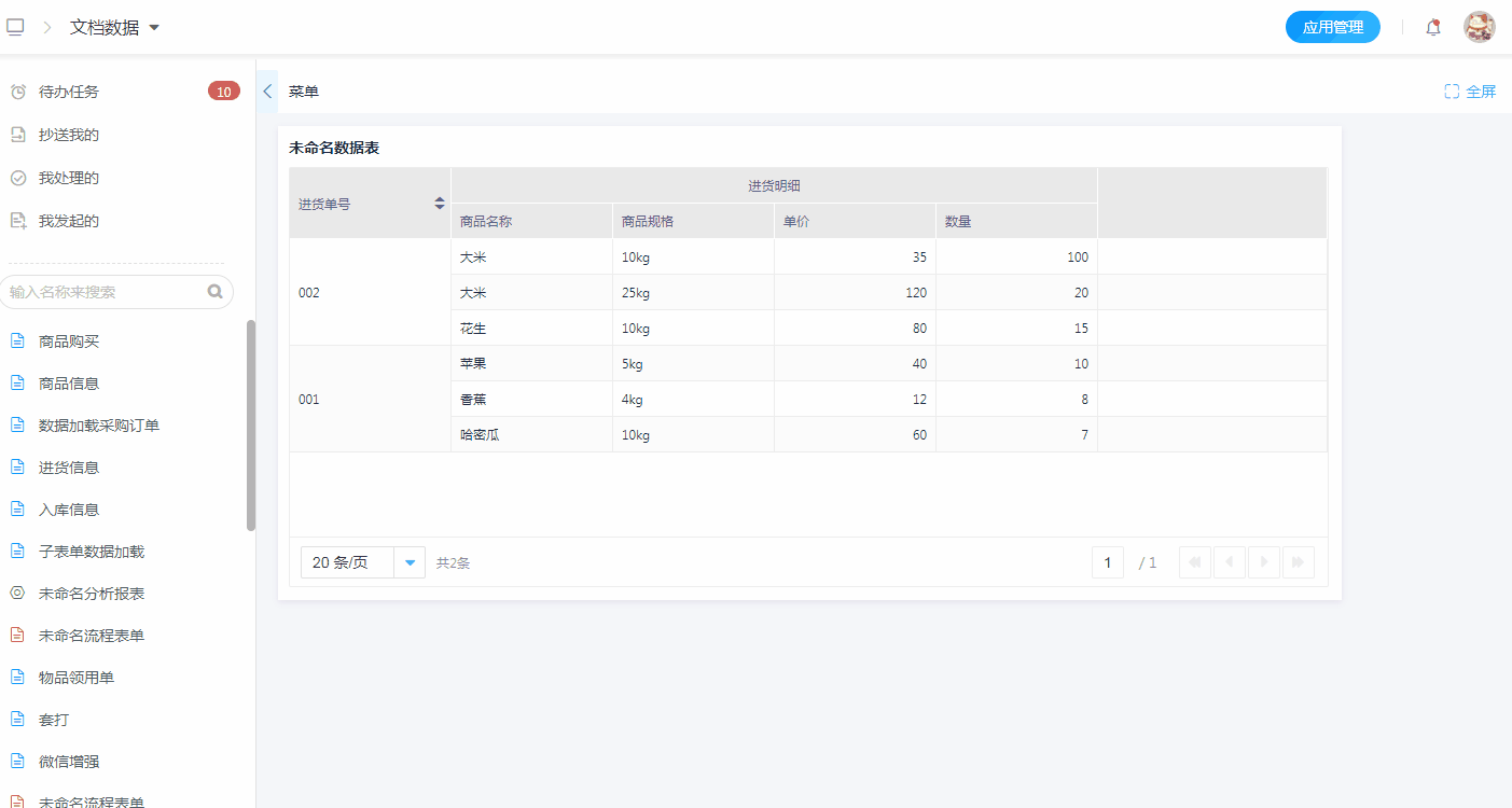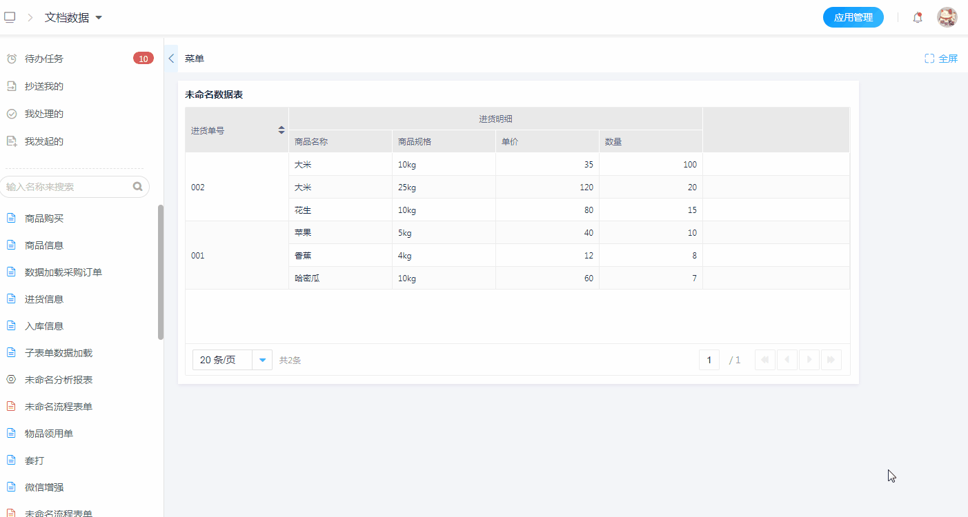 数据表的报表菜单-弹出表单模式,支持将选择的普通字段数据写入弹出表单的子表单字段中。注意开启数据多选才有效。