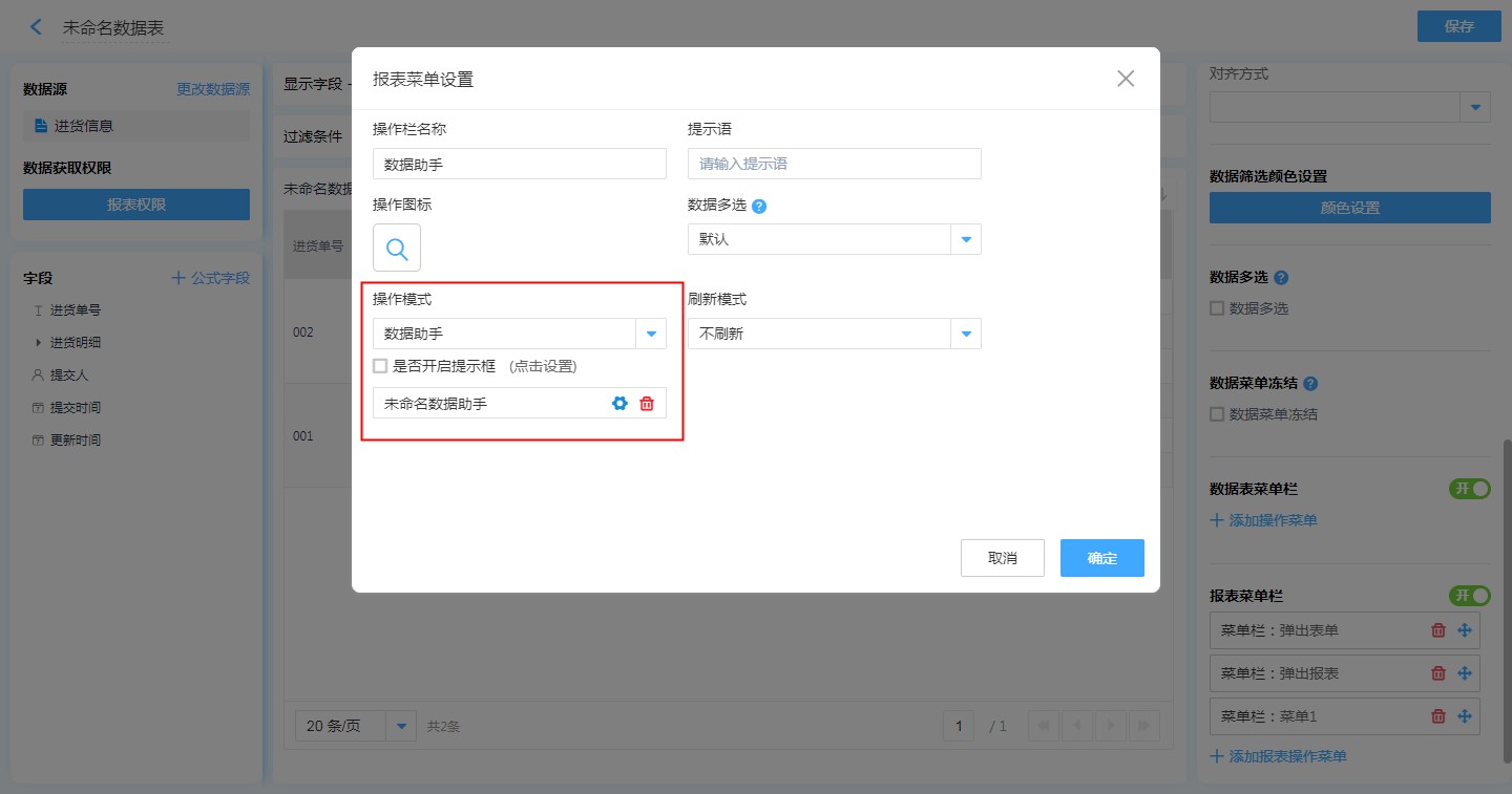 第一步:【目标报表的编辑页面】——【报表菜单栏】——【添加操作菜单】,配置相关属性,操作模式选择【数据助手】。