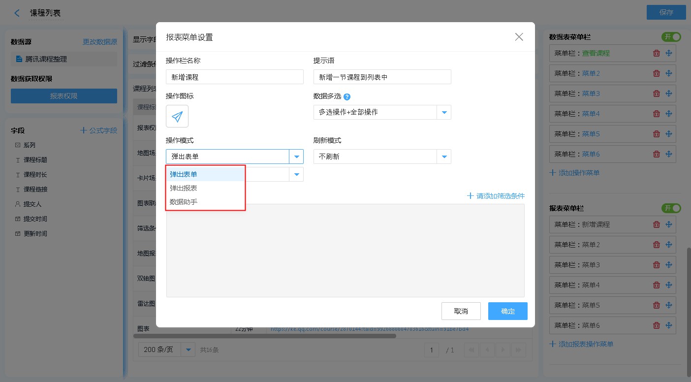 共有3种操作模式,分别为:弹出表单、弹出报表、数据助手。