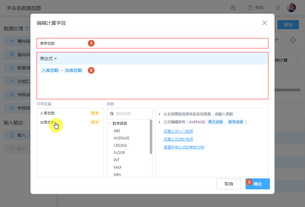 4. 配置:字段设置,配置计算字段,即可通过“入库”总数与“出库”总数,计算出最新剩余库存。