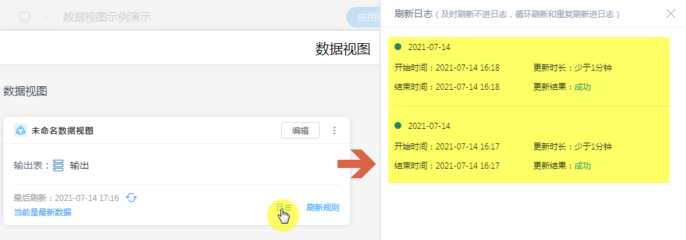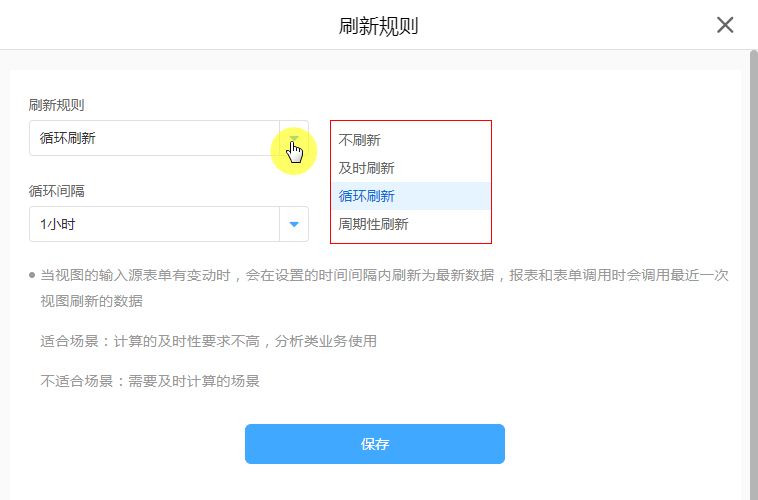 • 设置数据视图的刷新规则,设置规则后会定时在天/周/月/年的某天某个时间刷新数据,报表和表单调用时会调用最近一次的视图刷新的数据。一般用于大数据量时,周期性汇总分析时使用。