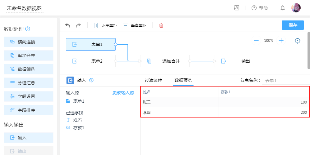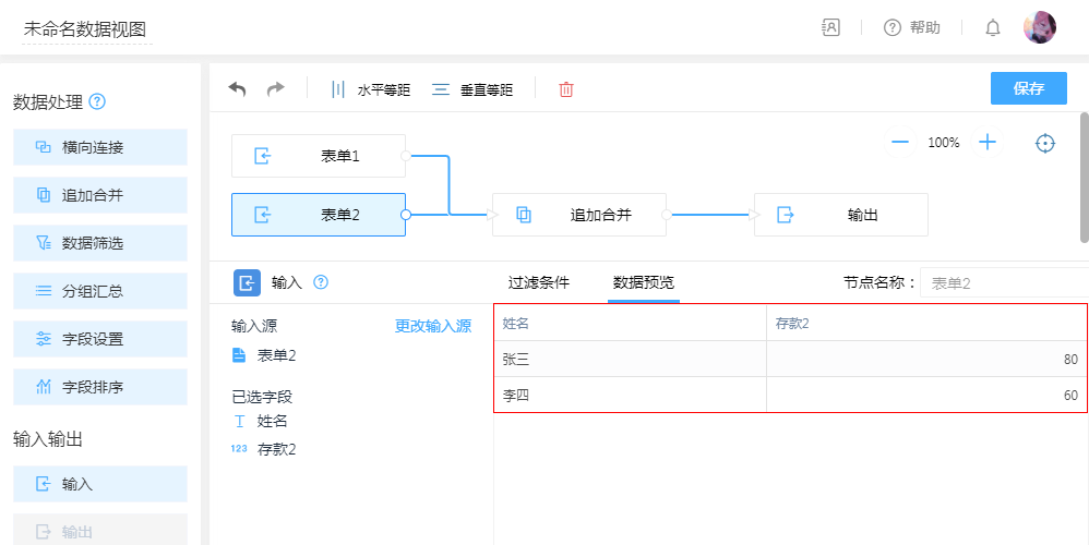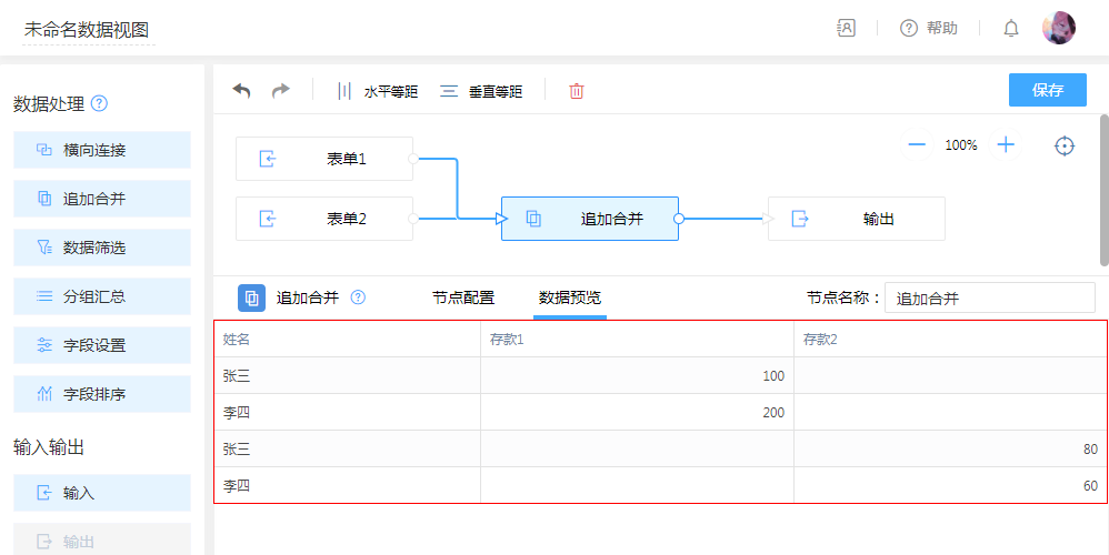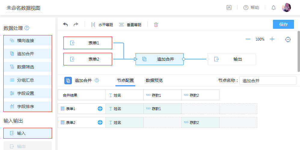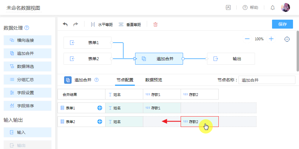 常用于将两个同类型表单合并到一张表里,默认将同类型同名字段合并为一列,对于同类型字段可以手动拖拽合并为一列。