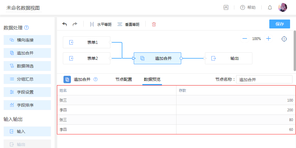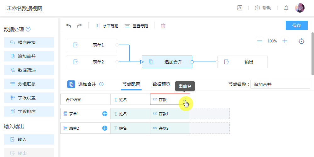 在“节点配置”手动调整不同名的字段为一列,即可查看当前效果。