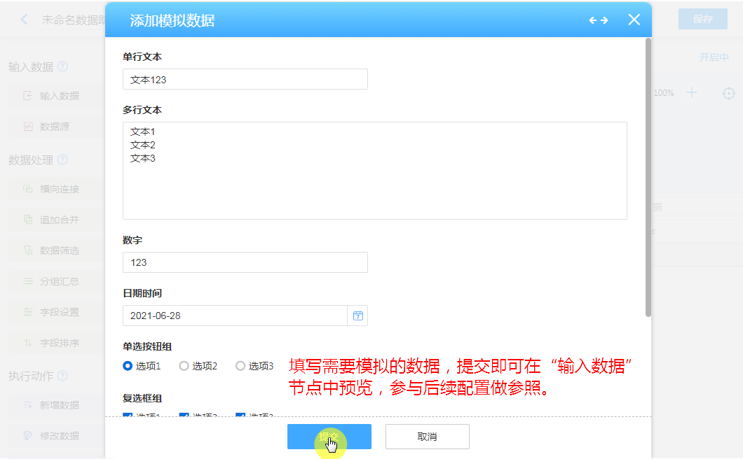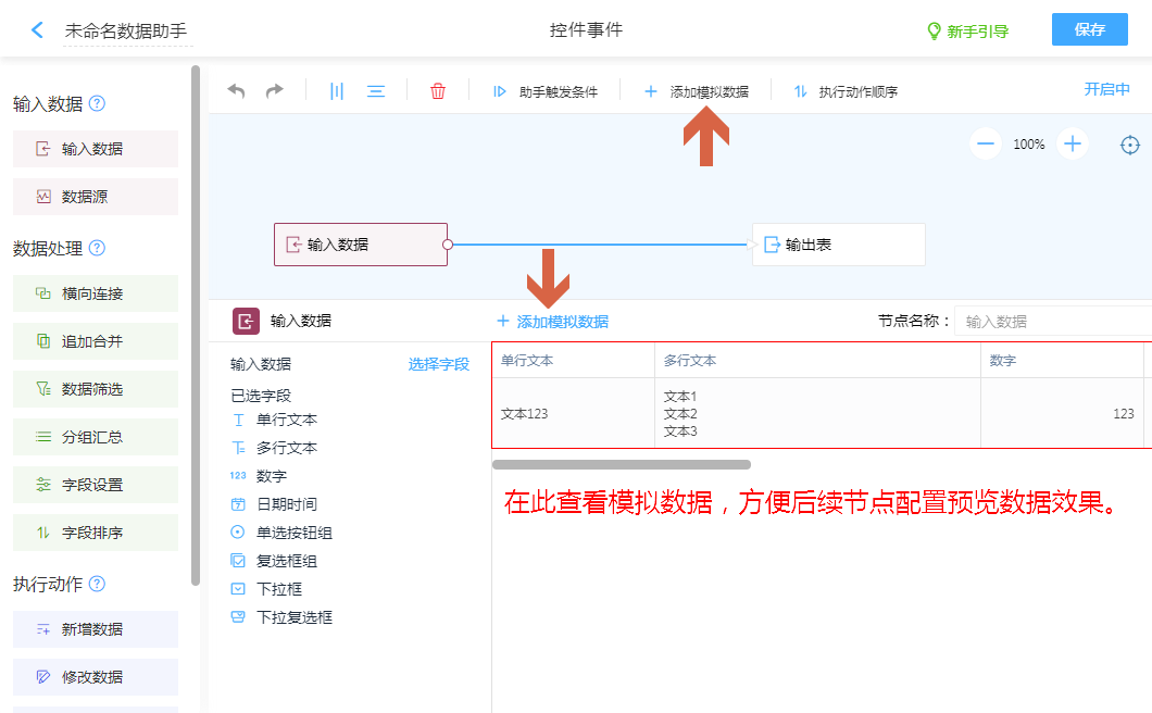 添加模拟数据方便配置其他节点功能,进行数据效果预览。