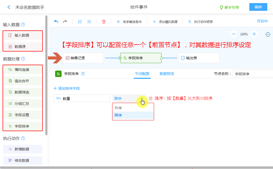 支持配置多个排序字段,分别进行升序或降序排序。
