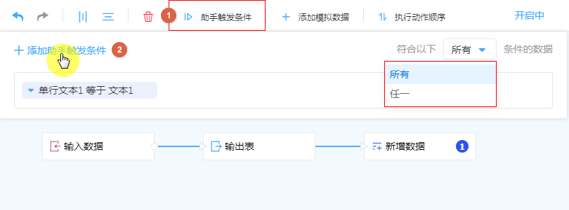 | ④ | 助手触发条件 | 根据“输入数据”与“子表单当前行”节点传入的数据进行条件判断,成立则执行助手功能。 |