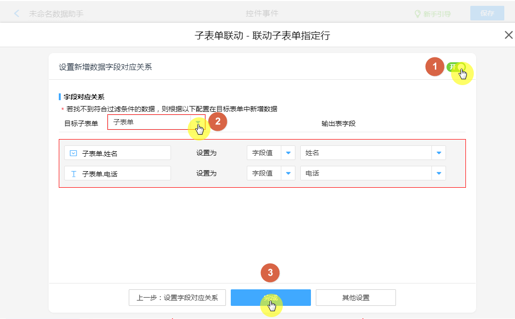 创建“子表单联动”动作节点,即可配置把“输出表”的数据,返回当前表子表单。