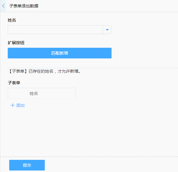 “数据表”有数据且条件符合,联动成功:返回“所配置的字段值”新增到当前子表单所匹配指定行。