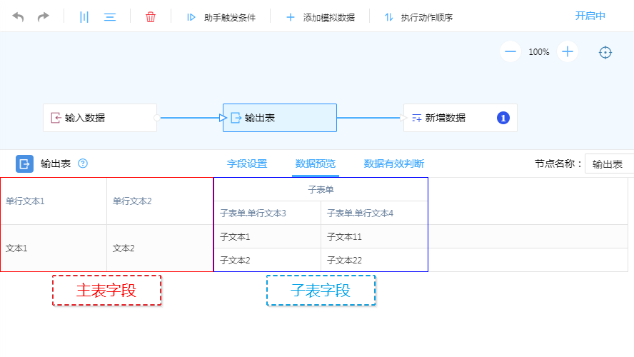创建“新增数据”动作节点,将“输出表”的数据新增至其他表单。
